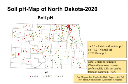 Components 1&2. Visual survey and soil sampling: Clubroot scouting was done visually by inspecting canola crop roots. The disease survey was conducted in over 40 counties in North Dakota. One field in every 5000 acres was targeted for scouting in each county. Soil samples were collected from fields to determine the pH of the soil and the number of resting spores per gram of soil. A minimum of 3-10 fields per county were targeted for scouting.