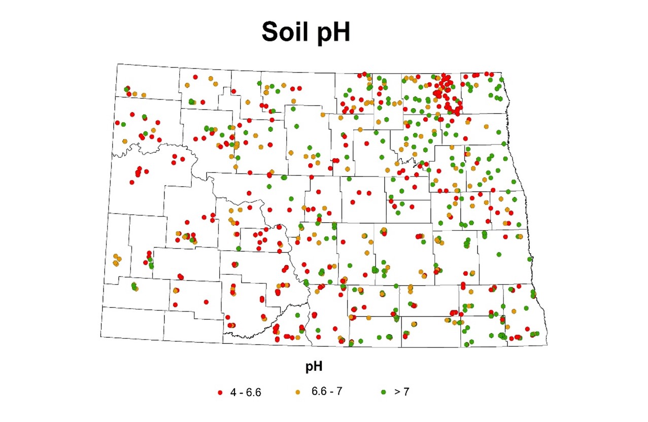 Figure 3: Map of counties in North Dakota indicating pH ranges detected by soil assays in the soil samples during the two-year survey.