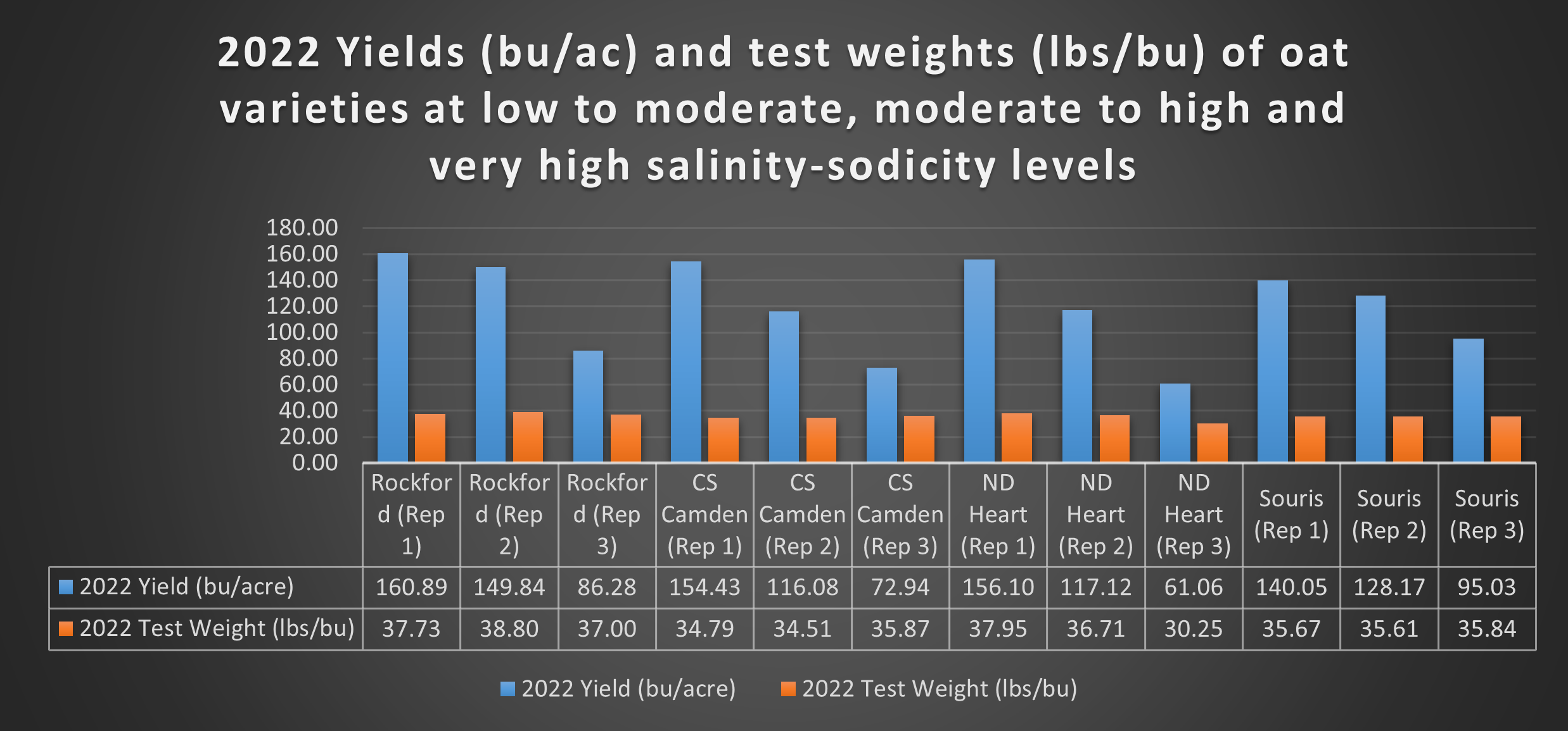 Barley and oats are some of the most salt and sodicity tolerant annual crops producers can profitably grow in North Dakota. However, at certain salinity and sodicity levels, even barley and oats can result in significant losses. Especially important are the levels of salinity and sodicity in the top six inches of the soils. Sensing the need to determine the economic threshold of soil salinity (Electrical Conductivity or EC) and sodicity (Sodium Adsorption Ratio or SAR) for barley and oats, four barley and four oat varieties were planted at the Langdon REC site in 2022 at three different levels of salinity and sodicity. This trial was a repeat of 2020 and 2021 trials. In addition, four canola varieties were added to the trial in 2022 to compare salinity and sodicity tolerances of the canola crop versus barley and oats.