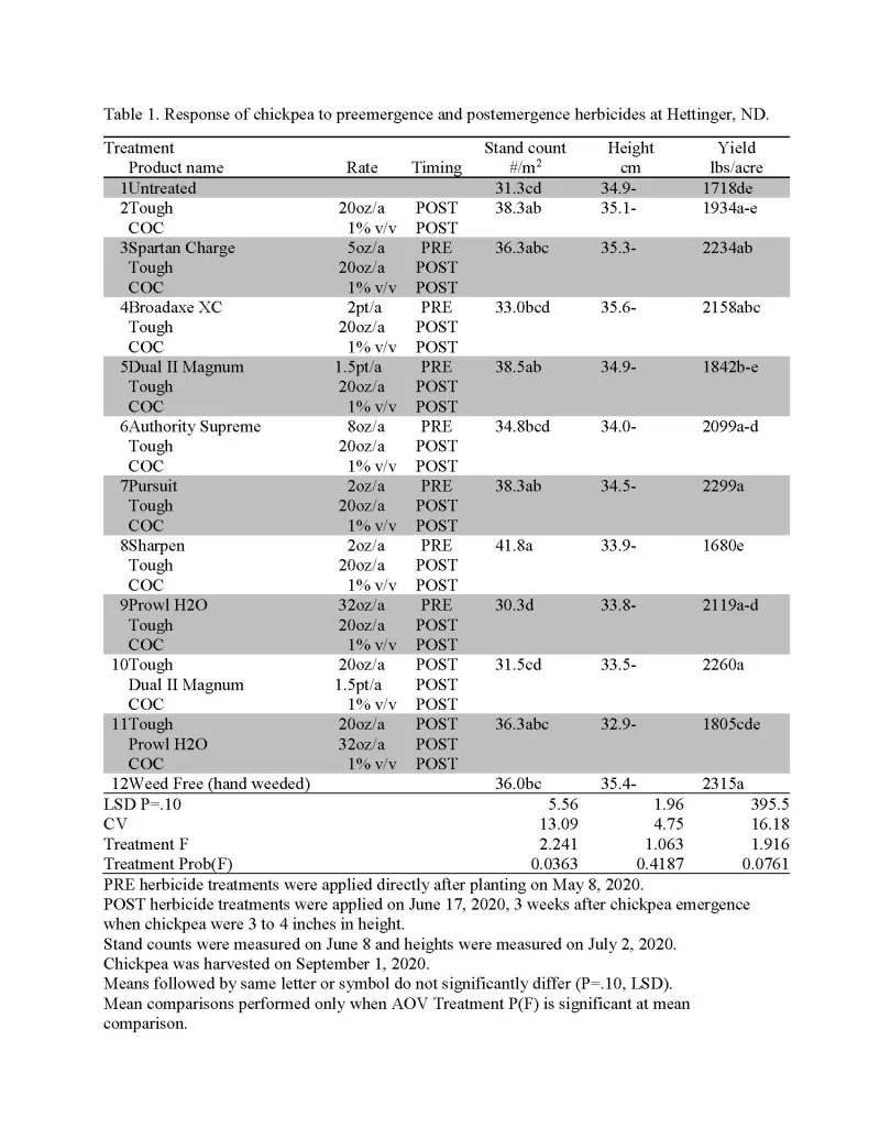 Chickpea ‘Frontier’ was planted on May 8, 2020 using a no-till drill at a rate of 40 seeds per square meter (174,000 seeds per acre) with granular chickpea inoculum at 4 lbs per acre. After planting, planned preemergence (PRE) herbicide treatments were applied using a tractor-mounted research plot sprayer using 8002 flat fan nozzles with a spray volume of 15 gallons per acre at a spray pressure of 38 PSI. PRE treatments included sulfentrazone plus carfentrazone (Spartan Charge), sulfentrazone plus metolachlor (BroadAxe XC), metolachlor (Dual II Magnum), sulfentrazone plus pyroxasulfone (Authority Supreme), imazethapyr (Pursuit), and saflufencil (Sharpen). Glyphosate was applied across the entire plot area to control existing weeds. Chickpea emerged on May 27. Postemergence application of pyridate (Tough) herbicide alone and tank-mixed with either pendimethalin (Prowl H2O) or metolachlor (Dual II Magnum) were applied on June 17, 2020 using the same methods described earlier. All treatments were compared with an untreated control (no herbicides other than the glyphosate applied at planting) and a weed free control (which was hand weeded). Stand counts were measured on June 8 using two quadrats (0.5 m2) per plot. Chickpea height (10 random plants per plot) was measured on July 17. Chickpea were harvest on September 1.