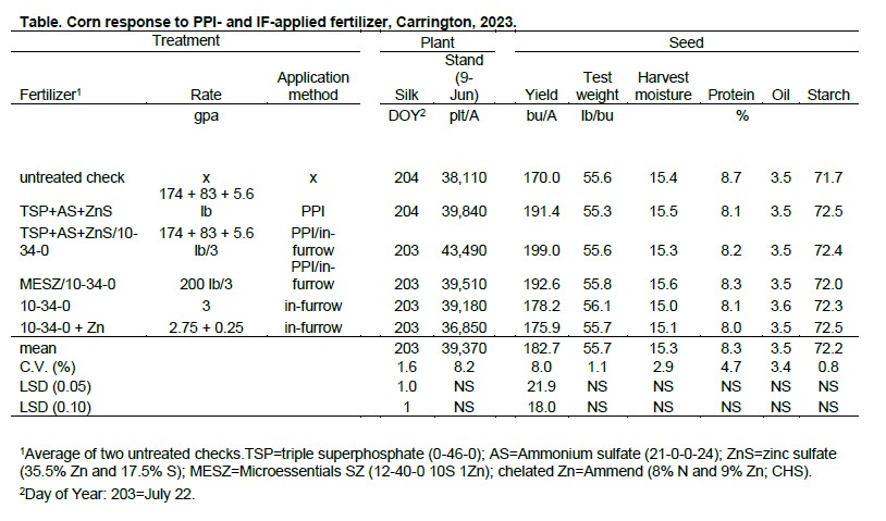 A field study continued in 2023 at the NDSU Carrington Research Extension Center, and supported by the ND Corn Utilization Council, to examine the performance of corn with preplant incorporated (PPI) and in-furrow (IF) applied phosphorus (P) and zinc (Zn) fertilizer. Experimental design was a randomized complete block with four replications. The trial was established on conventionally tilled, Heimdal-Emrick loam soil with 4.0% organic matter, 7.6 (0-6 inches) and 8.0 (6-24 inches) pH, 1.88 mmho/cm (0-6 inches) and 2.41 mmho/cm (6-24 inches) soluble salts, 36 lb nitrate-N/acre, 7 ppm (low) P, 187 ppm K and 0.44 ppm (low) Zn. Wheat was the prior crop in 2022. Urea (100 lb N/acre) was PPI on May 17. PPI treatments were applied May 18 and incorporated with a field cultivator plus harrow. DeKalb ‘DKC32-86RIB’ (82-day relative maturity) Roundup Ready corn was planted with a John Deere 71 4-row flex planter on May 18 in 30-inch rows, and included IF fertilizer treatments. NDAWN monthly rain (inches): May=4.2; June=3.3; July=2.1; August=1.8; September=2.2; October=1.9; and 6-month total=15.5. Grain was combine harvested November 21.