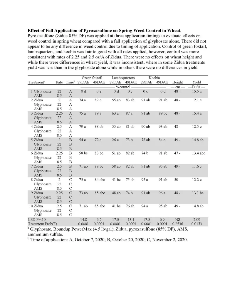 Pyroxasulfone (Zidua 85% DF) was applied at three application timings to evaluate effects on weed control in spring wheat compared with a fall application of glyphosate alone. There did not appear to be any difference in weed control due to timing of application. Control of green foxtail, lambsquarters, and kochia was fair to good with all rates applied, however, control was more consistent with rates of 2.25 and 2.5 oz/A of Zidua. There were no effects on wheat height and while there were differences in wheat yield, it was inconsistent, where in some Zidua treatments yield was less than in the glyphosate alone while in others there were no differences in yield.