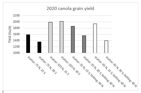 Figure 1. 2020 canola grain yields in response to fertilizer treatments applied at planting and at bolting.