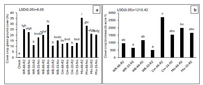 Figure 2. (a) Cover crop green ground cover on June 27, 2024, Carrington, ND. (b) Cover crop biomass at soybean R2 stage, July 25, 2024, Carrington, ND. Abbreviations: WR = winter rye; WB = winter barley; Cm = winter camelina; Mix = WR+WB+Cm; Check = no cover crop; 66 = 66% of recommended cover crop seeding rate; 33 = 33% of recommended cover crop seeding rate; R2 = cover crop termination date at soybean R2 stage; No = no termination for cover crops. Bars with different letters are statistically different at alpha = 0.05.