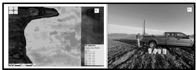 Figure 1. (a) Soil electrical conductivity map from EM38, Carrington, ND, 2024. (b) Soil sampling for soil electrical conductivity characterization, Carrington, ND, 2024.