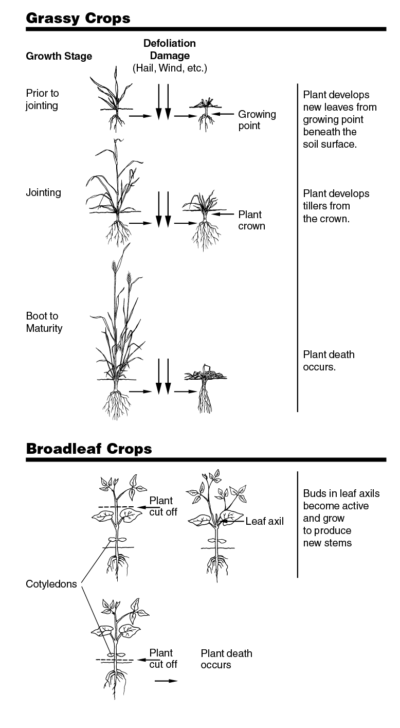 During the seedling stage, injury that results in stand reduction will cause the greatest yield reductions. Leaf injury or loss during early stages has a minimal effect on yield; however, as the crop approaches reproductive developmental stages, leaf damage or loss is more detrimental to yield. An assessment of potential plant stand soon after crop injury occurs (within a week) is critical to avoid delays if replanting is necessary.