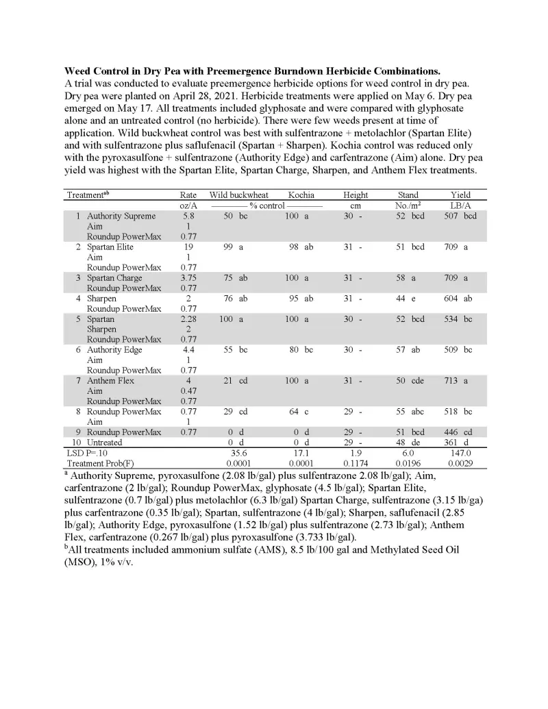 A trial was conducted to evaluate preemergence herbicide options for weed control in dry pea. Dry pea were planted on April 28, 2021. Herbicide treatments were applied on May 6. Dry pea emerged on May 17. All treatments included glyphosate and were compared with glyphosate alone and an untreated control (no herbicide). There were few weeds present at time of application. Wild buckwheat control was best with sulfentrazone + metolachlor (Spartan Elite) and with sulfentrazone plus saflufenacil (Spartan + Sharpen). Kochia control was reduced only with the pyroxasulfone + sulfentrazone (Authority Edge) and carfentrazone (Aim) alone. Dry pea yield was highest with the Spartan Elite, Spartan Charge, Sharpen, and Anthem Flex treatments.
