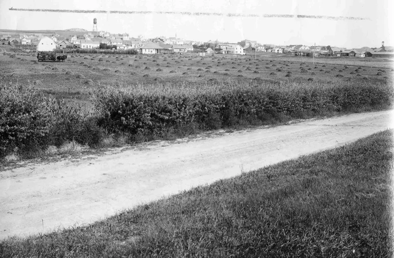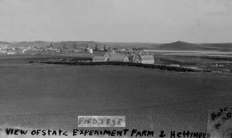Historical photo of the Hettinger Research Center and the town of Hettinger in the background. Look at all those elevators!
