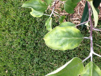 - Foliar sprays of chelated iron may provide quick green-up of the foliage but this treatment is temporary and trees do not always respond