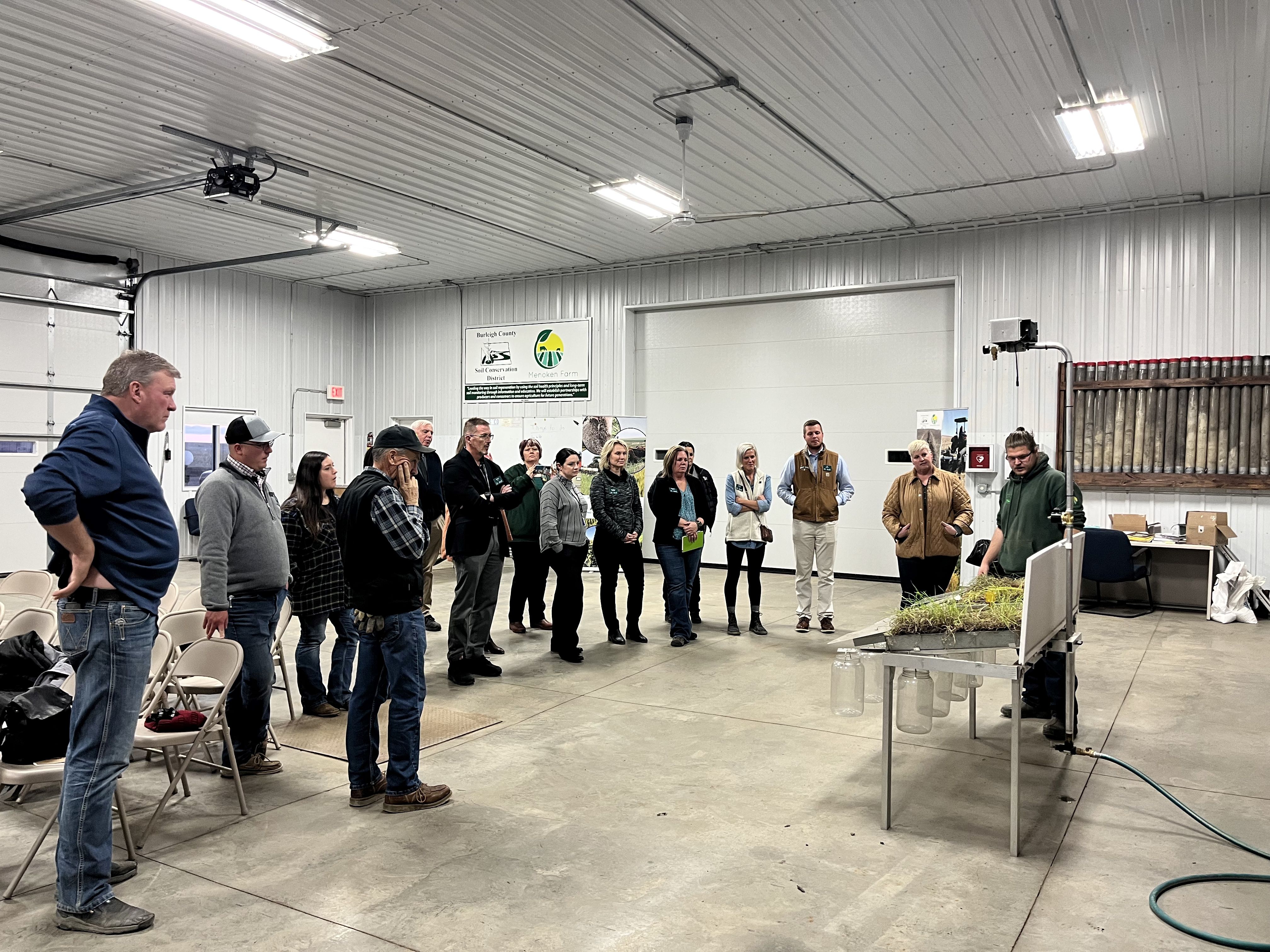 Post-lunch, the ND Association of Rural Electric Cooperatives hosted Class X, providing insights into cooperative history and leadership styles. The discussion covered rural development projects across North Dakota, culminating in a tour of the new Lineworker Training Center. Darrell Oswald, Class VII, hosted Class X at Menoken Farm, which included a brief history of the farm, a soil health demonstration, and discussions on leadership within conservation.