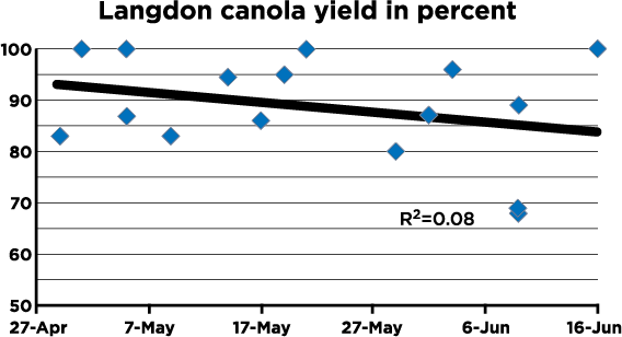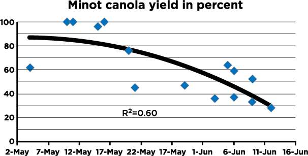 The decision to spray should be made only when: 1) yield potential is above normal (at least 40 bushels or 2,000 lb./A), 2) weather leading to early bloom has been wet (at least 1 to 2 inches of rain in the two weeks prior to early bloom), 3) more rain or high humidity is expected and 4) sclerotinia has been a problem in recent years in fields currently planted to canola or in other fields nearby. A fungicide is more likely to be needed if canola is planted on tight rotations (three years or less). The NDSU canola pathology program provides a sclerotinia risk map for North Dakota during the growing season.