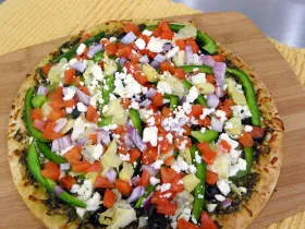 Preheat oven to 450 F. Spread pesto on pizza crust. Top with tomatoes, bell peppers, olives (if desired), red onions, artichoke hearts and feta cheese. Bake for eight to 10 minutes, or until cheese is melted and browned.