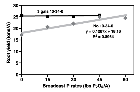 Historically, P was applied to sugarbeets at relatively high rates, compared with other crops in the North Dakota/ Minnesota region. Broadcast P rates of more than 100 pounds of P2O5 per acre were common, given that most soil tests for P in the region were in the low to medium categories. However, studies in northwestern Minnesota found that a 3 gallons/acre rate of 10-34-0 with the seed at planting resulted in similar root and sugar yield, compared with a much larger rate of broadcast P (Figure 2) (Sims and Smith, 2003).