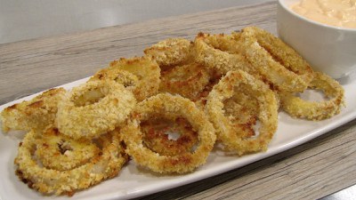 Spray the rings with nonstick spray (optional, but it helps to get them crispy). Bake rings for 10 to 15 minutes until golden brown. Remove from oven and serve with your favorite dipping sauce.