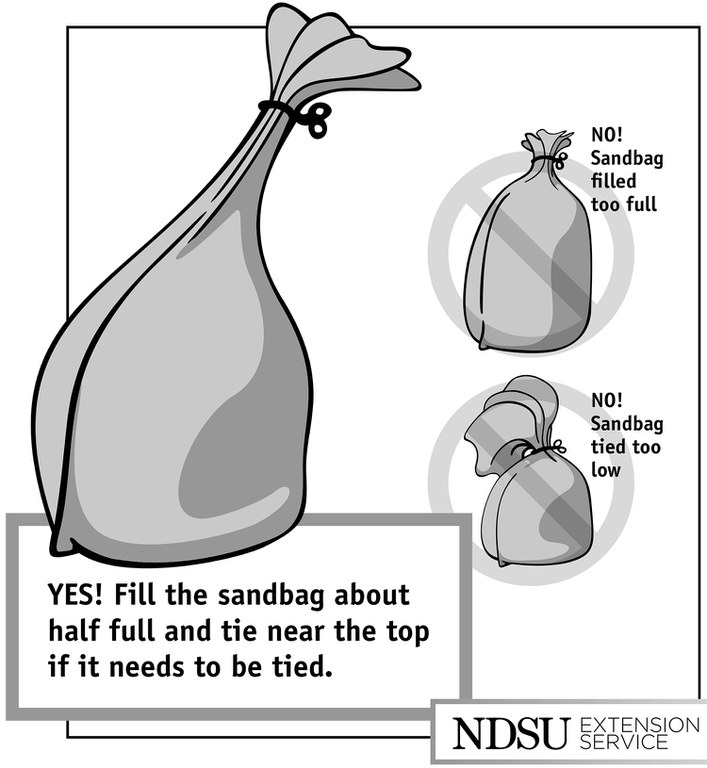 To fill a sandbag properly make sure it is filled about half full and tie the bag near the top, if it needs to be tied.