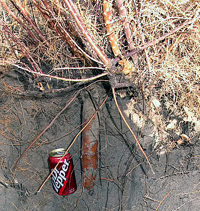 The root system of leafy spurge is extensive and consists of numerous coarse and fine roots that occupy a large volume of soil. Roots are most abundant in the upper foot of soil, but some roots can extend to a depth of 15 feet or more. The roots are woody and durable in structure, with numerous buds capable of producing new shoots. The root system contains a large nutrient reserve capable of sustaining the plant for years.