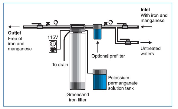 This type of system will remove soluble and suspended particles of insoluble iron and manganese from the source water. Backwashing the sand filter to remove precipitated iron and manganese is an important part of continued filtration. As with the greensand filter, the system flow rate should be checked to make sure it can provide the needed rates for backwashing.