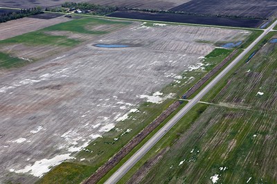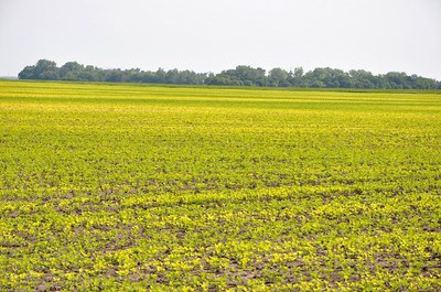 Soybeans with severe iDC in the Red River Valley, Bearden soils, near Amenia, N.D. Yellow soybeans are growing on the "bumps" of the landscape, barely 6 inches higher than the depressions. Free lime has accumulated on theses bumps, and following successive wet years, soil EC also is much higher in these areas. Greener soybeans are in the depressions.