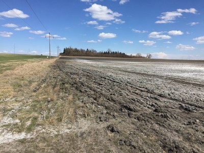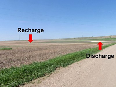 A saline seep along U.S. Highway 83 in North Dakota. The discharge area is where salts have accumulated. Water needs to be managed between the discharge and recharge area.