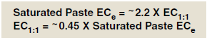 Nearly all North Dakota soils have salt EC values greater than zero. Recent North Dakota experiments indicate that soils with an EC value greater than 0.2 millimho per centimeter (mmho/cm) — the common term of electrical conductance used by soil scientists — have a negative effect on most North Dakota crops. A mmho/cm is equivalent to a deci-siemen/meter (dS/m), so 0.2 mmho/cm is equivalent to 0.2 dS/m.