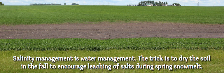 Saline development in a nearly level landscape with a shallow, saline water table. Continuous cropping will help decrease development.
