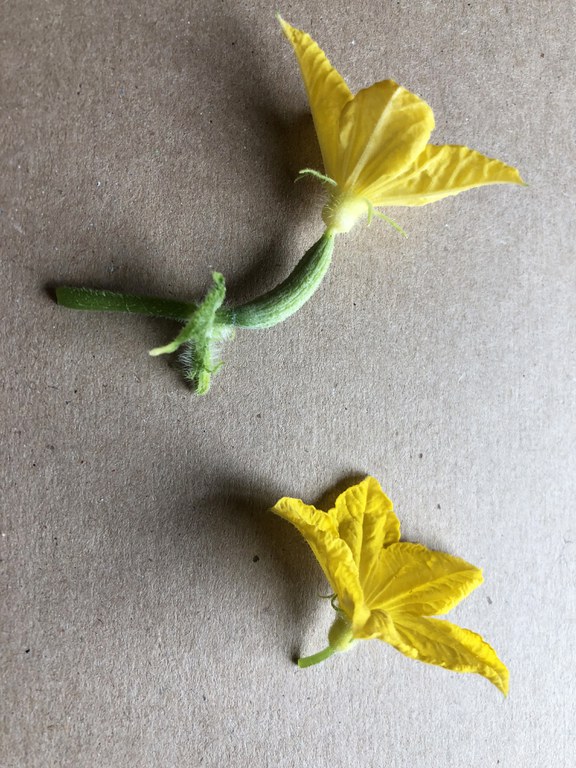 Figure 2. Imperfect flowers. Cucumber female flower with its ovary (top) and male flower (bottom).