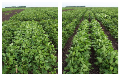 14-inch rows (left) and 28-inch rows (right) at 150,000 pls/A in late July during year two of the study at Prosper.