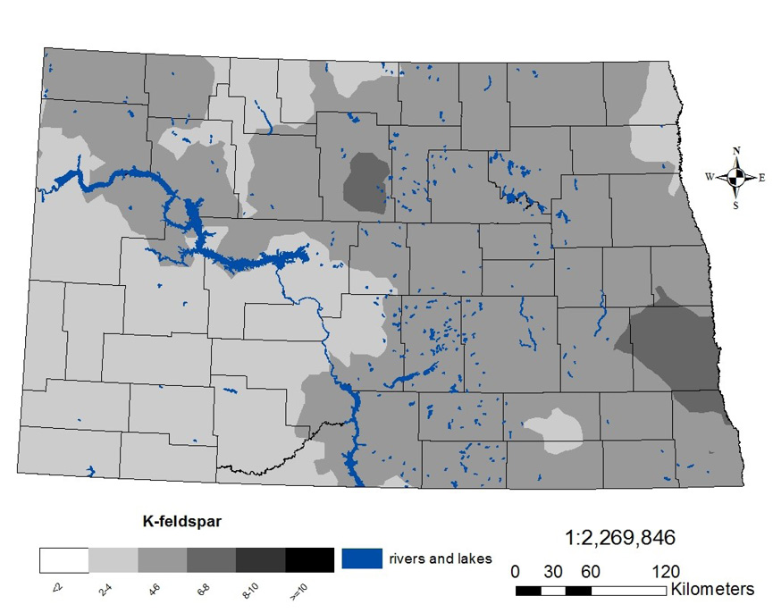 Recent K-rate research in North Dakota has shown that consideration of the clay chemistry in the soil is very important in predicting whether corn yield will increase with K if the soil test is lower than the critical level. The magnitude of yield increases in our K-rate studies probably was moderated by the amount of potassium feldspar as a portion of total minerals in the soil in the eastern part of North Dakota, where the studies were conducted (Figure 1).