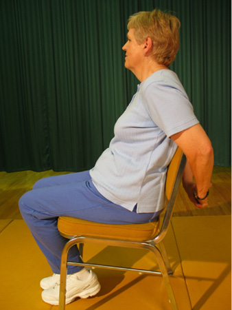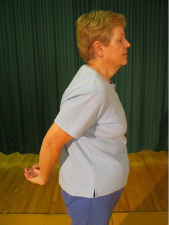 2. To stretch shoulders and pectoral (chest) muscles: Clasp hands behind back and straighten arms as much as possible. Move arms away from back, keeping chest and head up. Hold for six seconds. Return arms to start position and relax for six seconds. Repeat four times.