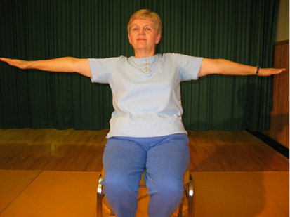 15. To stretch trunk: With arms out to the side, level with shoulders, shift shoulders sideways to right. Hold. Stretch to left. Hold. Don’t bounce!