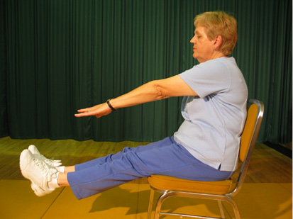 10. To stretch hamstrings: Straighten legs out in front, level with chair seat. Reach toward toes. Hold, relax, repeat. Watch your balance!