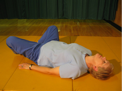 9. To stretch groin: Lie flat on the floor, face up. Relax with knees bent and the soles of your feet together. Push lower back toward floor. Hold for six seconds, then relax for five seconds. Repeat twice.
