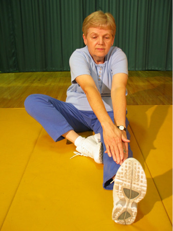 8. To stretch hamstring muscles (back thigh): Sit on floor. Straighten right leg and bring sole of left foot to rest next to inside upper part of straight leg. Lean slightly forward with arms and hands extended toward ankle of straight leg. Find an easy stretch, hold for six seconds, then relax for five seconds. Repeat three times for each leg. To help you stretch down, place a towel around foot of straight leg. Grasp ends of towel and pull.