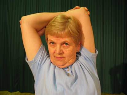 4. To stretch back of arm: Sit or stand straight. Grab one elbow with the opposite hand and gently pull your elbow behind your head. Hold for six seconds, then relax. Repeat twice.