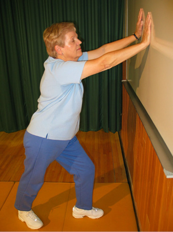 11. To stretch the gastrocnemius (calf): Stand two to three feet away from a solid support and, with arms and hands extended, lean against it. Bend one leg and place foot on floor in front of you, leaving other leg straight behind you. Slowly move your hips forward until you feel a stretch in calf of straight (back) leg. Be sure to keep heel of foot of straight leg on floor with toes pointed straight ahead. Hold for six seconds, then relax for five seconds. Switch legs. Repeat twice for each leg.