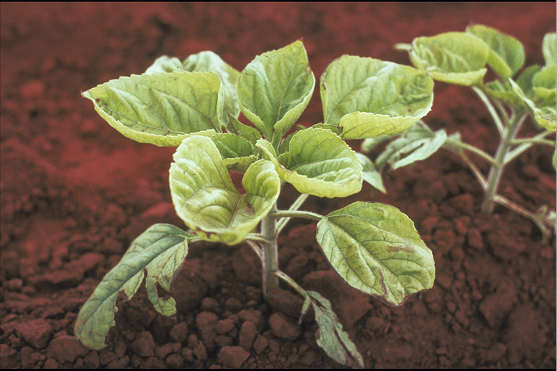 • In seedlings, the main symptom is an interveinal chlorosis of young leaves with no leaf distortion.