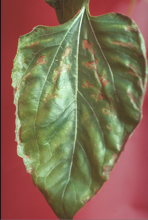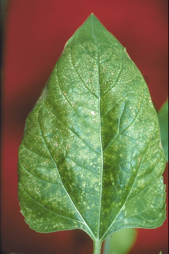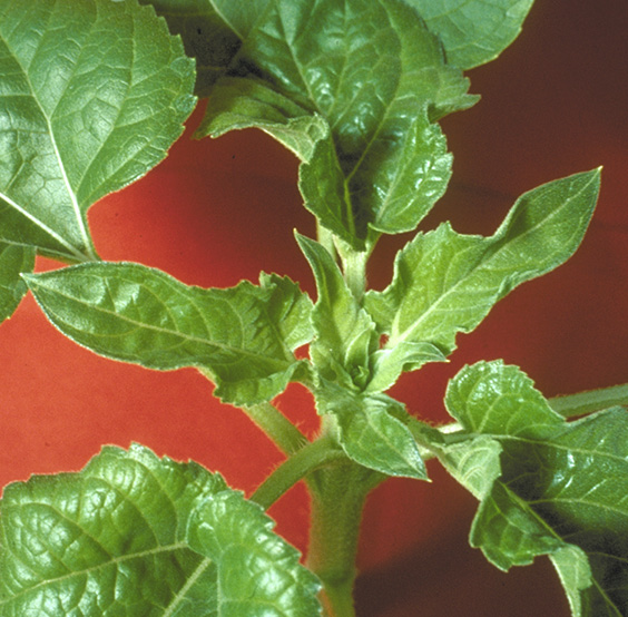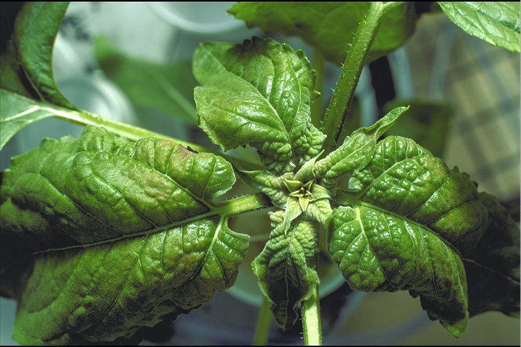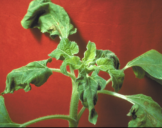 Veinal chlorosis (strikingly yellow) and distortion of expanding leaves, small black spots on trichomes of lower leaf blades and petioles and of the lower stem; dark, angular necrosis on lower leaves