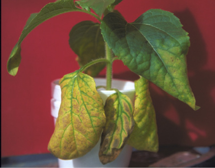 FIGURE 2 - Chlorosis and marginal necrosis are most severe on the older/lower leaves.
