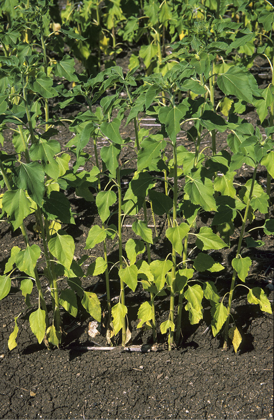 • Symptomatic sunflower plants are indicators of boron deficient soils.
