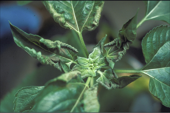 FIGURE 1 - Severe crinkling and thickening of newly-emerged leaves