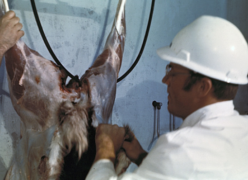 Score along the vertical spine of the back line and then remove the loin by cutting and peeling it loose from the groove between the ribs and backbone (Figure 9).