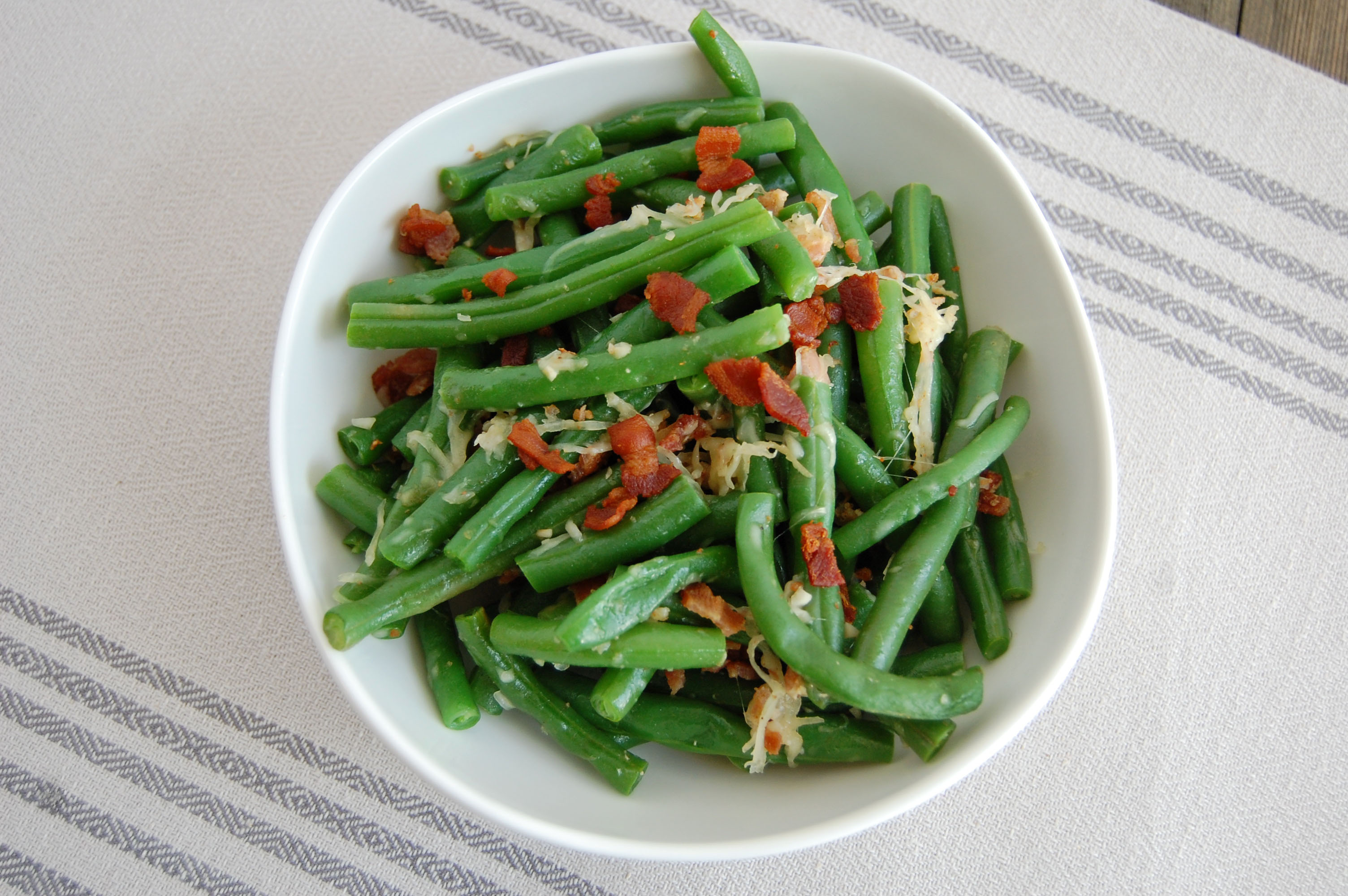 Cook and then chop the bacon. Cook the beans by placing them into a large pot of boiling, salted water. Fill another pot or bowl with ice water. Cook the beans until they can be pierced with a fork (usually 3 to 5 minutes). Remove the beans and place them in ice water. Drain well and place in oven-safe pan. Preheat oven to 350 F. Combine the bacon, garlic and parmesan cheese in a bowl, then mix with beans. Bake for 8 to 10 minutes.