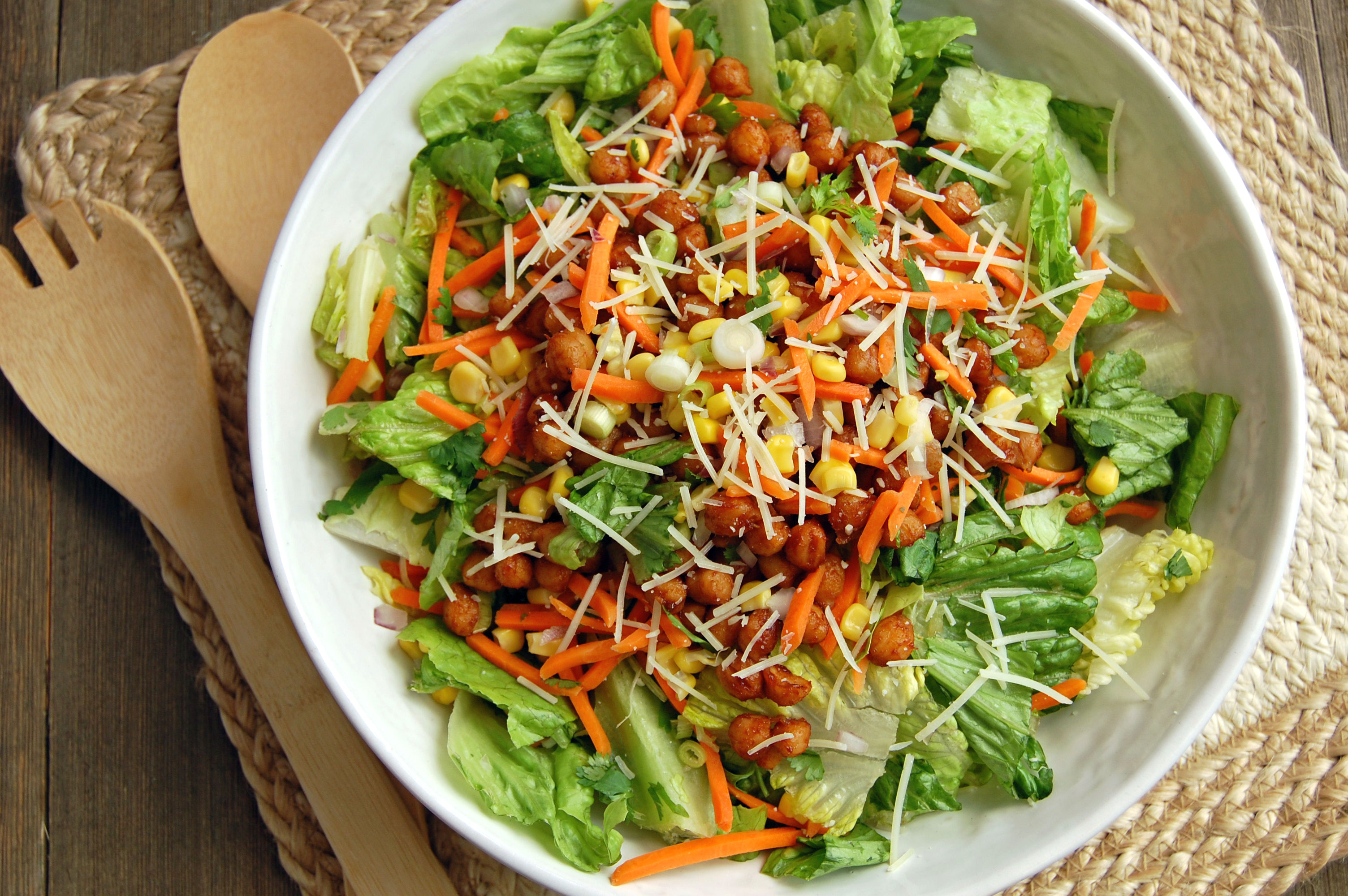 In a skillet, combine the chickpeas and barbecue sauce over low heat for 10 minutes, stirring occasionally. In a large bowl, toss together the lettuce, corn, carrots, onions and cilantro. Place a layer of romaine lettuce in bowls and top with chickpeas and your favorite ranch-style dressing, if desired.
