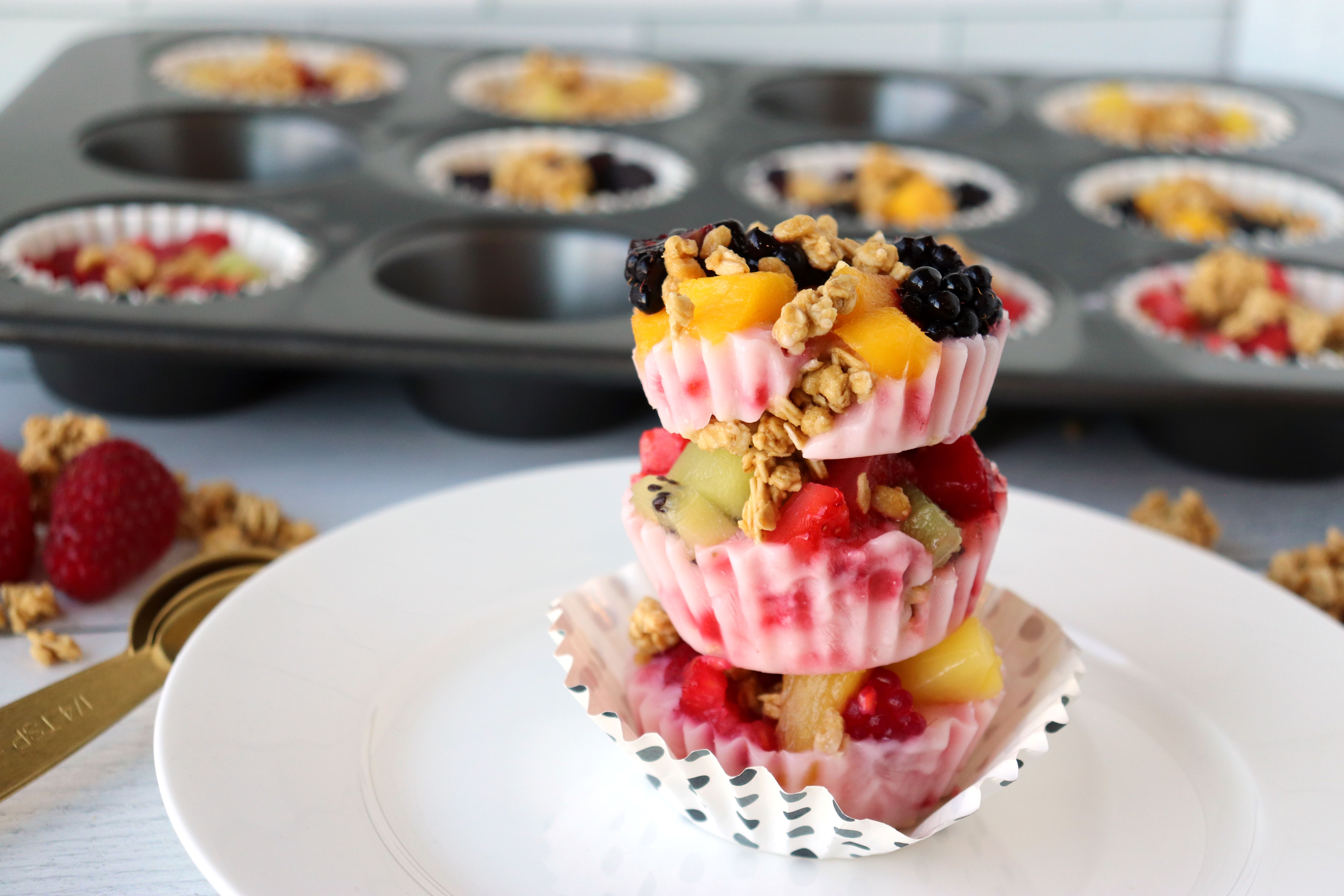 Line a 12-cup muffin pan with paper liners. Sprinkle about 2 teaspoons of granola into the bottom of each cup. Set aside. In a medium bowl, add yogurt and fresh fruit. Using a dough blender or fork, mash fruit into yogurt, until mostly mixed in, with just a few chunks remaining. Using a rubber spatula or wooden spoon, stir until well mixed. Spoon 2 tablespoons of the fruit and yogurt mixture into each cup, creating an even layer. Tap the pan to smooth out each layer. Press about 1 tablespoon of fresh fruit into the top of each cup. Sprinkle about 1 teaspoon granola over the fruit. Place the pan in the freezer and chill until firm, about 2-4 hours.
