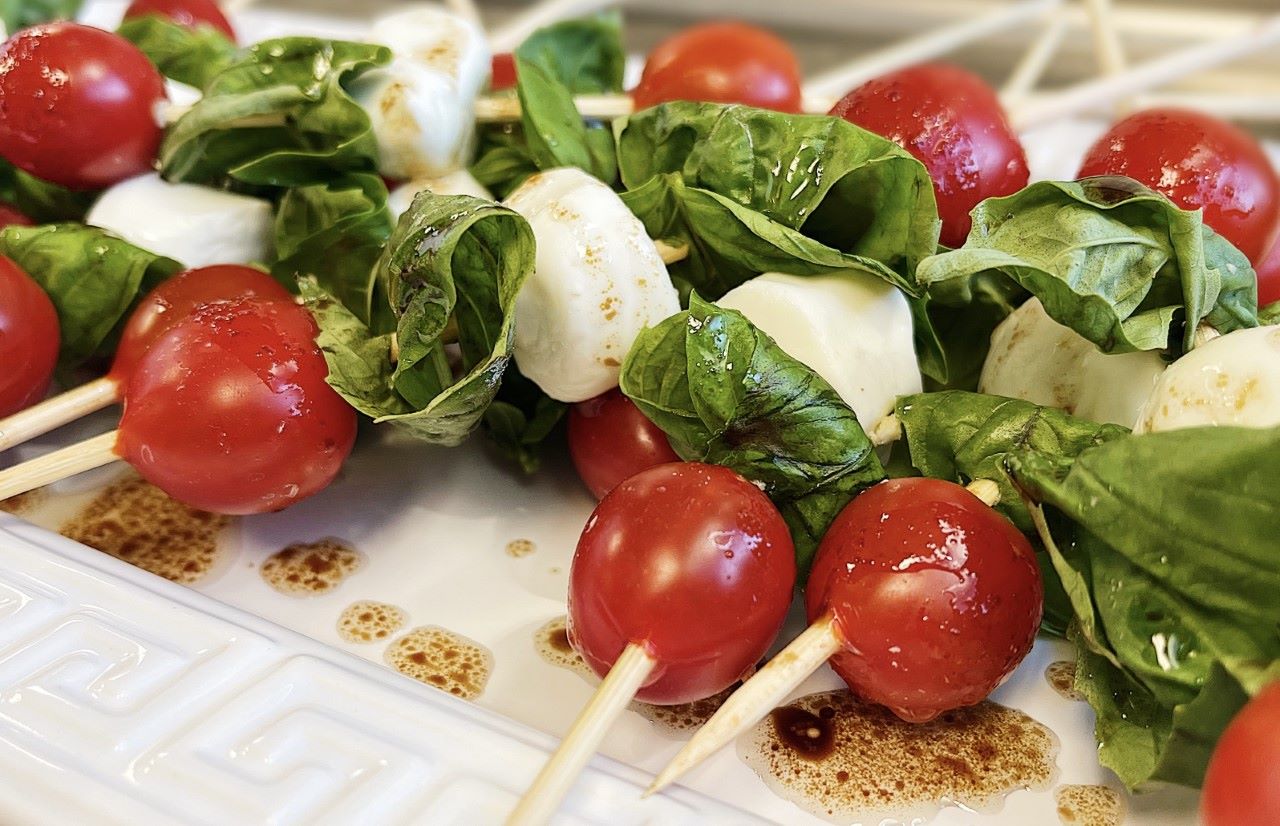On each of 12 appetizer skewers, alternately thread 2 tomatoes, 1 cheese ball and 2 basil leaves. Whisk olive oil and vinegar; drizzle over kabobs. Serve as a side dish with your favorite grilled protein, such as beef, chicken or pork.