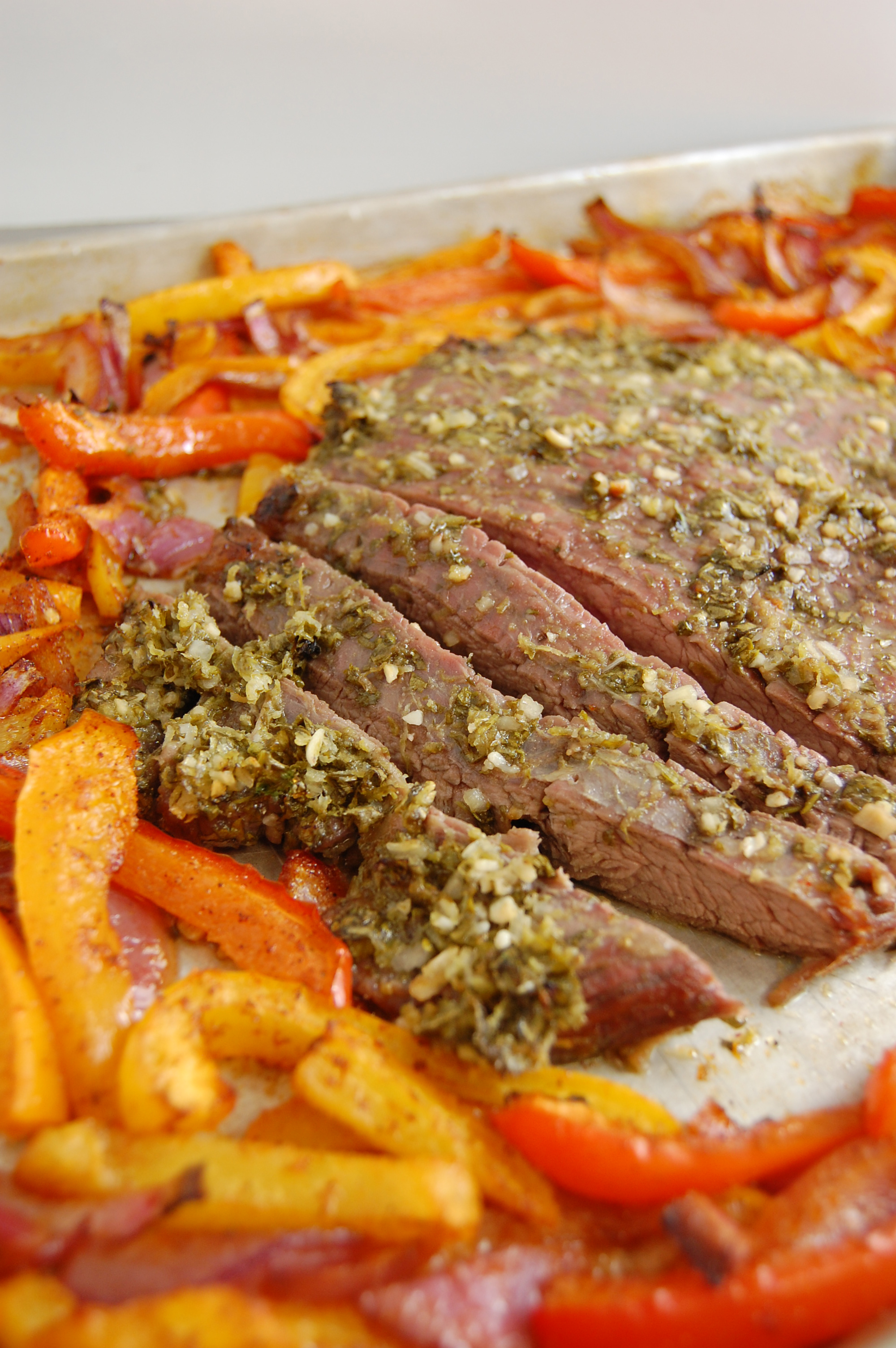 Preheat oven to 450 degrees. Take meat out of refrigerator 30 minutes prior to cooking. Slice onions and pepper and add to a bowl with all the vegetable seasoning; mix well. Using a large sheet pan, lay the steak in the middle and spread vegetables around the beef. Cook for 13 minutes, then broil on high for two minutes. After broiling, remove from oven and allow to rest for five minutes before slicing. When slicing, cut against the grain.