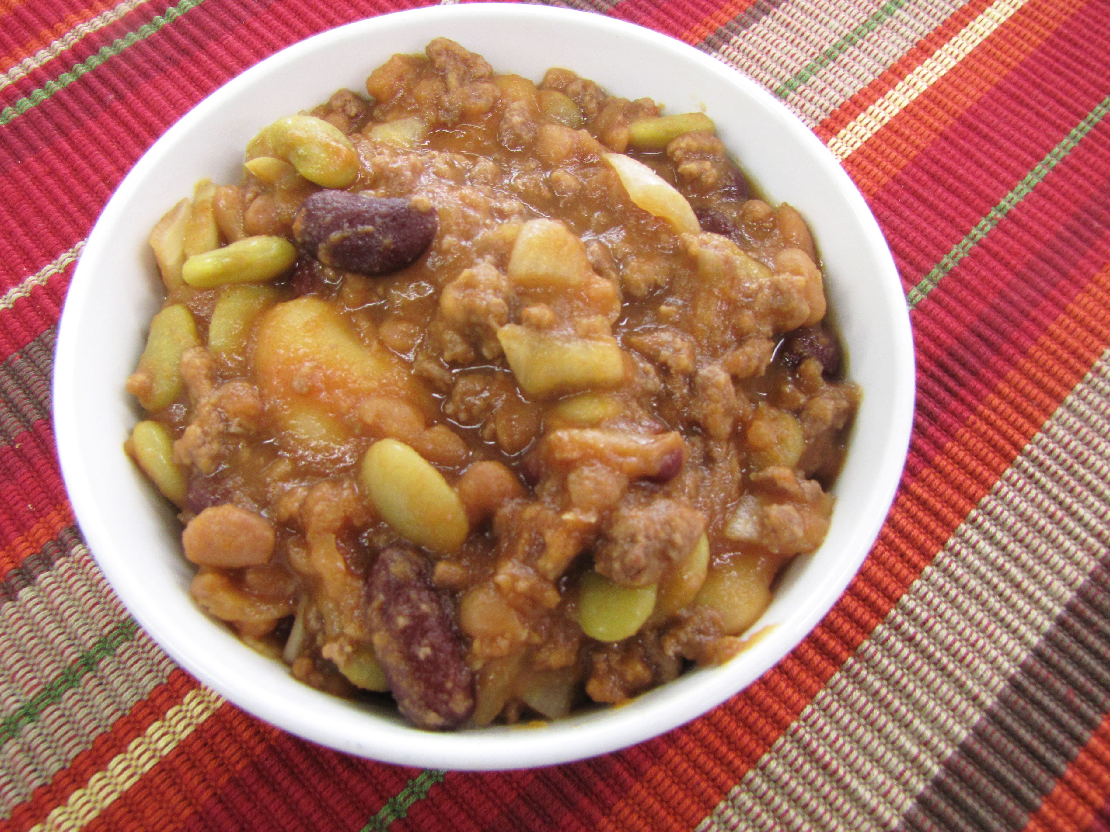 Brown meat and fry bacon. Mix all ingredients and cook in a slow cooker on high for three hours or low for eight hours.
