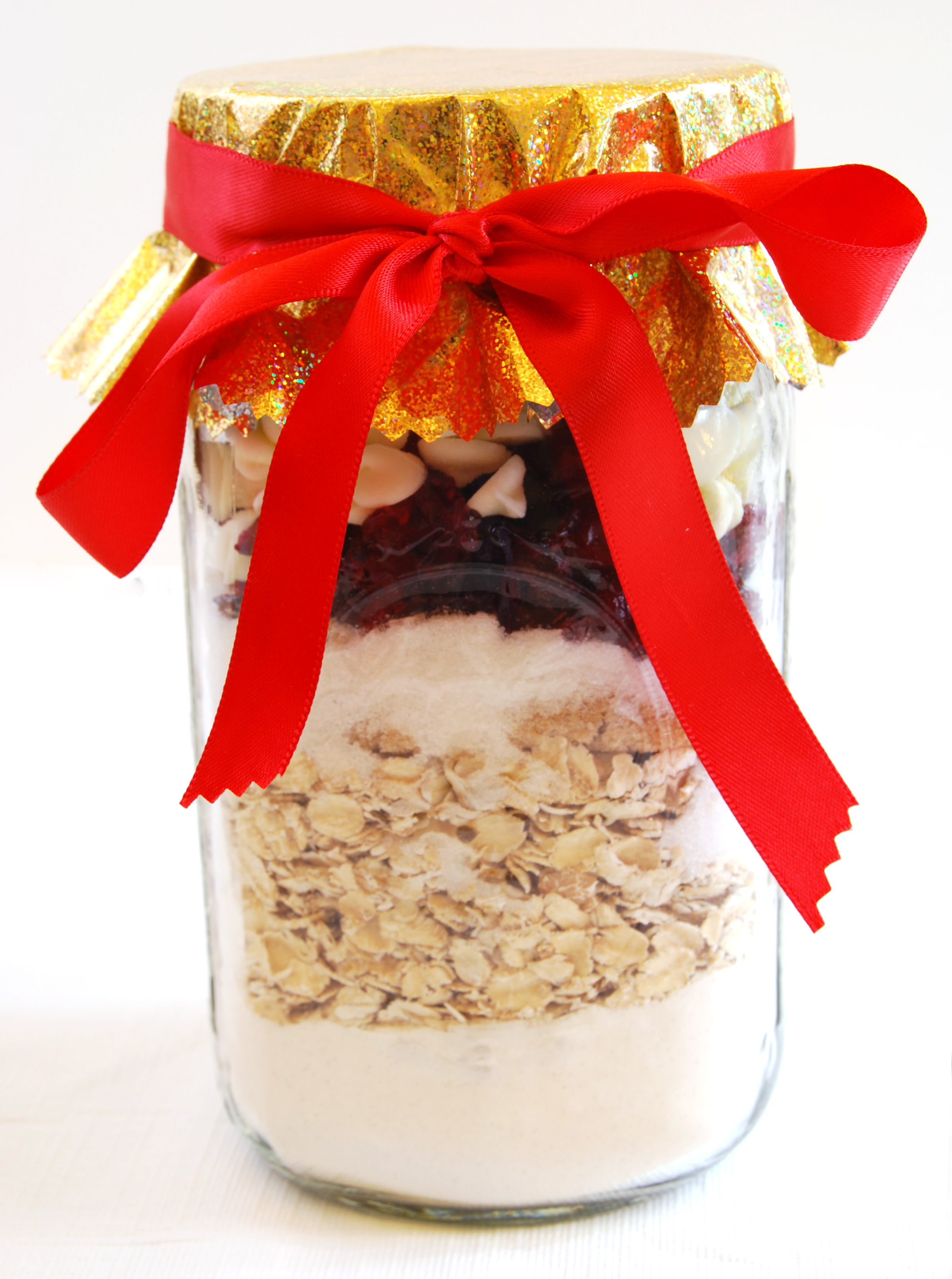 Layer the ingredients in a clean, quart-sized jar. Cover the jar tightly with a lid, decorate it and attach a copy of the recipe.