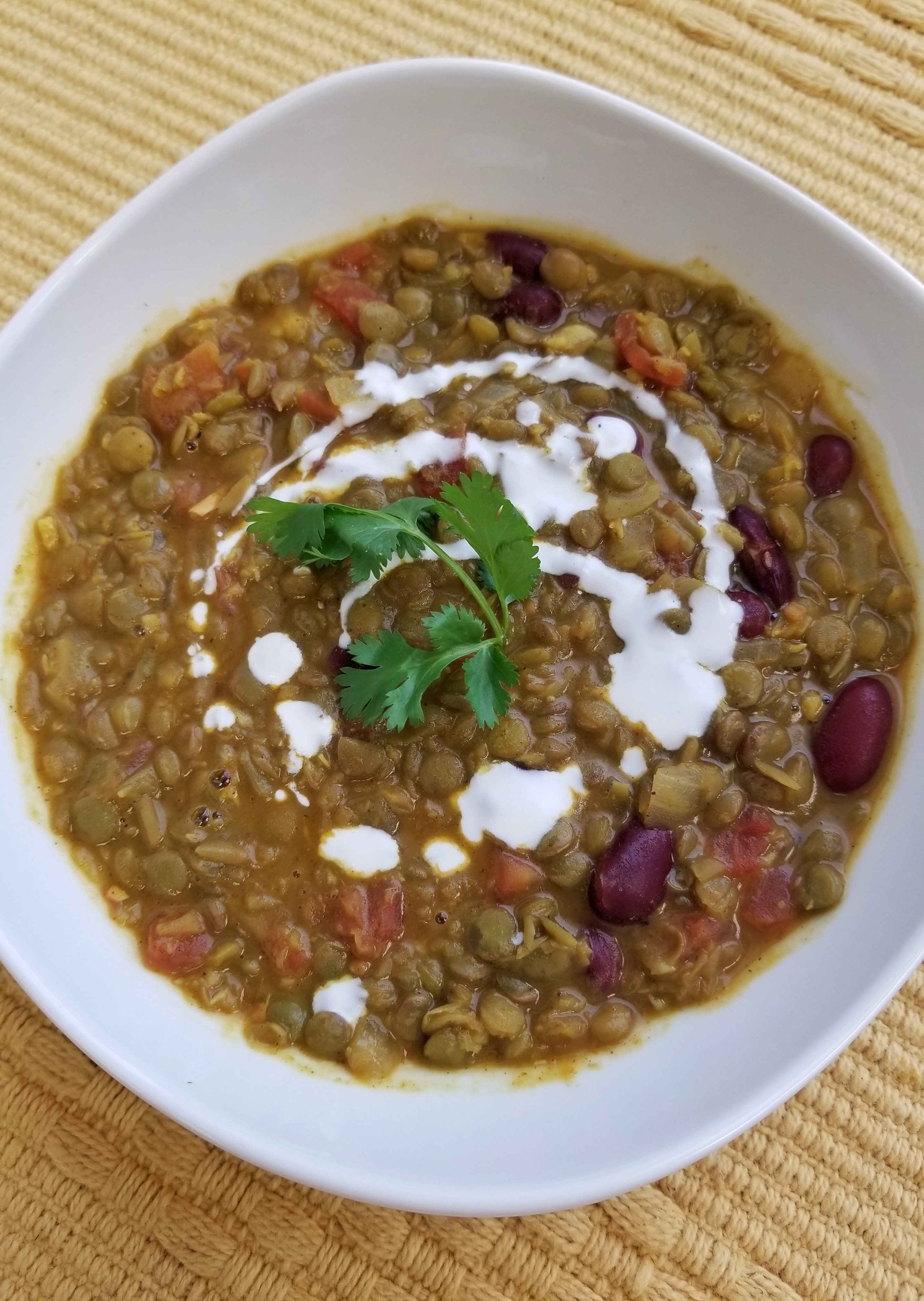 In a large saucepan, warm oil. Once oil is heated, add onion, garlic, and ginger to the pan and sauté for 7-8 minutes until the onions are slightly caramelized and the mixture is fragrant. To the onion/garlic/ginger mixture, add turmeric, cumin, garam masala, and paprika. Sauté until fragrant. Add the cooled lentils. Add the can of dark, red kidney beans, drained and rinsed. Add the can of coconut cream. Add in the crushed tomatoes and the salt.