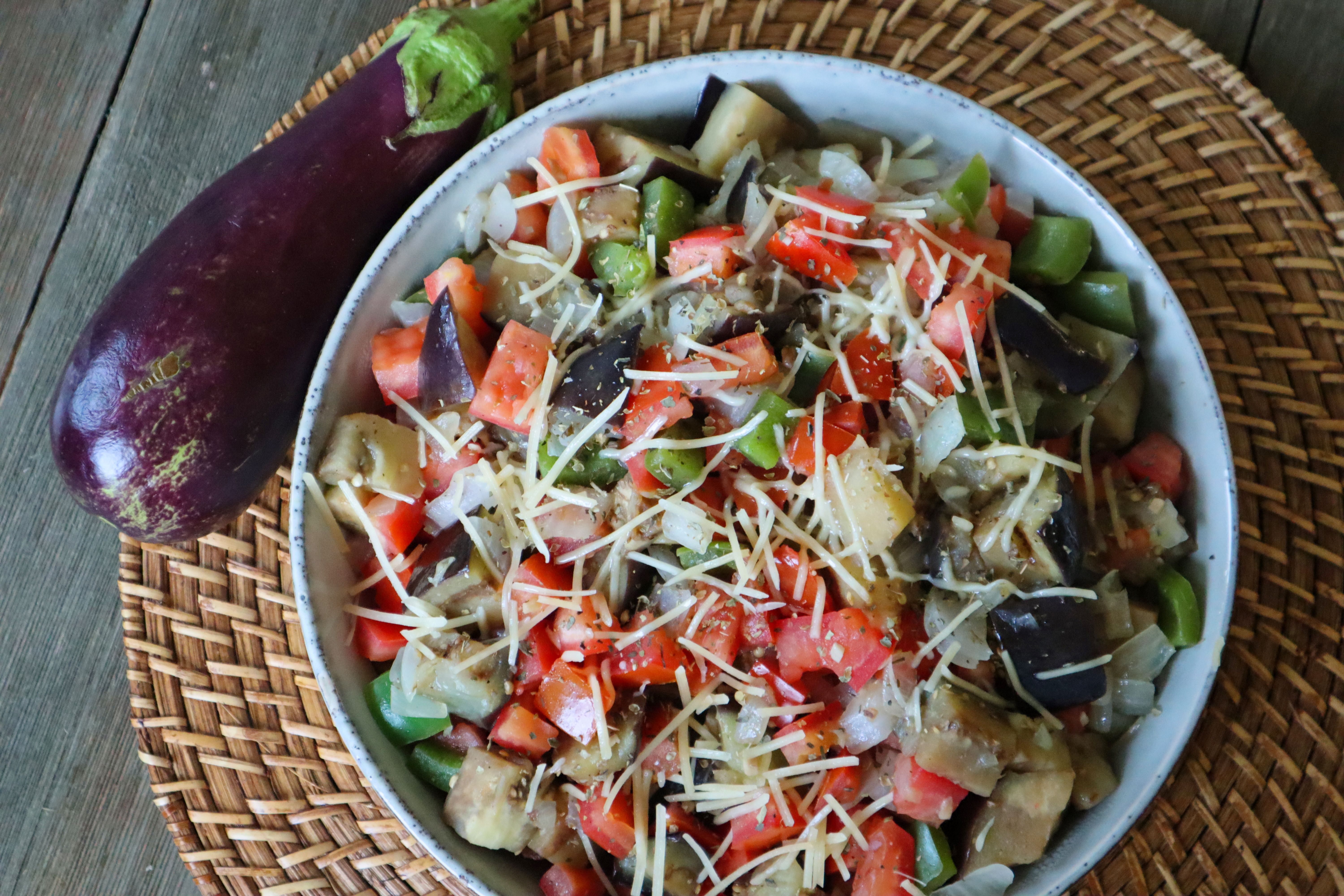 Eggplant, tomatoes and red pepper sprinkled with cheese? Who knew vegetables could be this tasty?